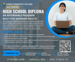 Lamar Community College (LCC), a leader in accessible and affordable education, is proud to offer a tuition-free high school diploma program for adults. With only a one-time $50 fee, the program provides a convenient and low-cost pathway for individuals seeking to complete their high school diploma. Earning a high school diploma can expand employment opportunities, provide access to federal financial aid, and create a seamless transition into certificate and degree programs at LCC.