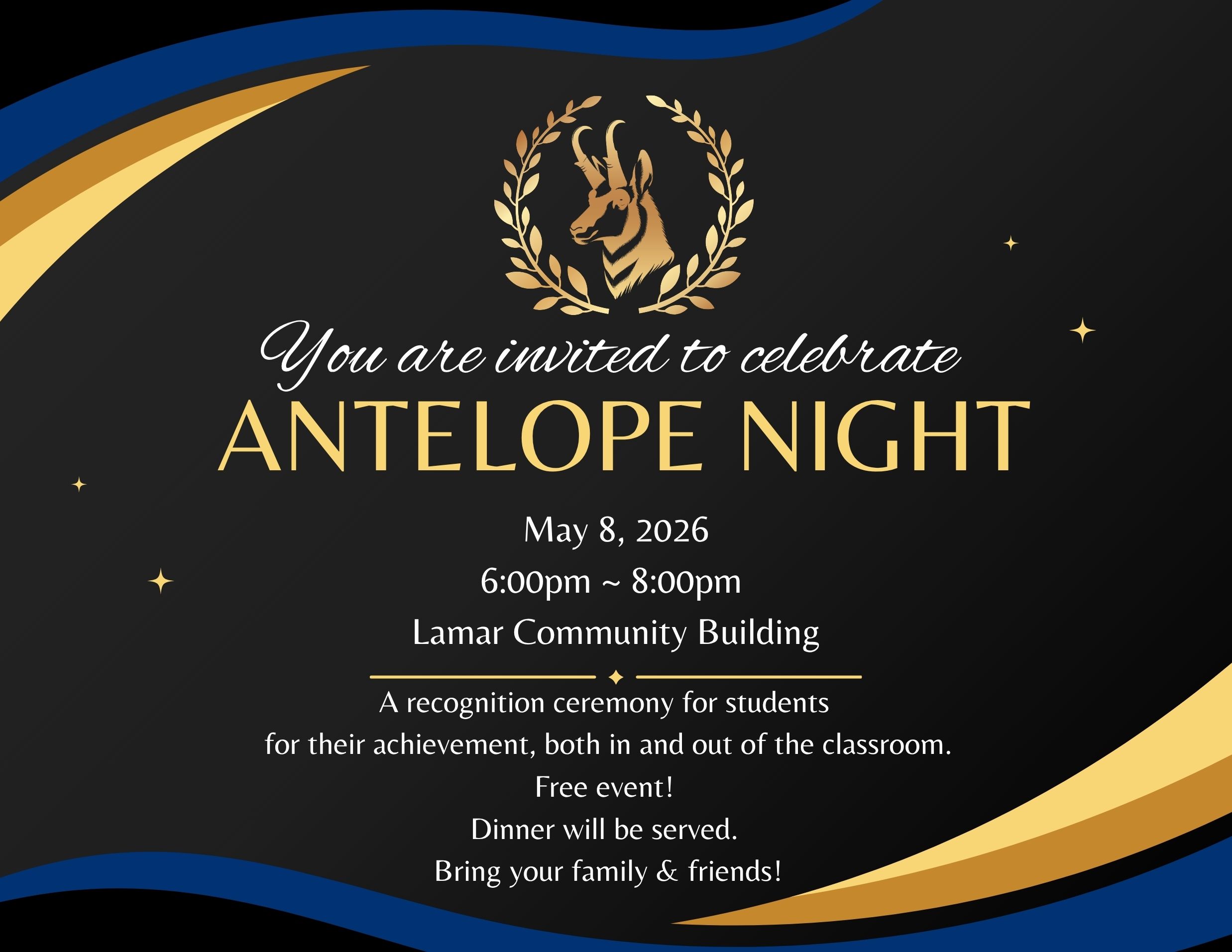 Antelope Night is our award ceremony, honoring student achievements both in and outside the classroom. We invite family and friends to join us for an evening of celebration, enjoy a delicious dinner, and cheer on the outstanding accomplishments of our students!”